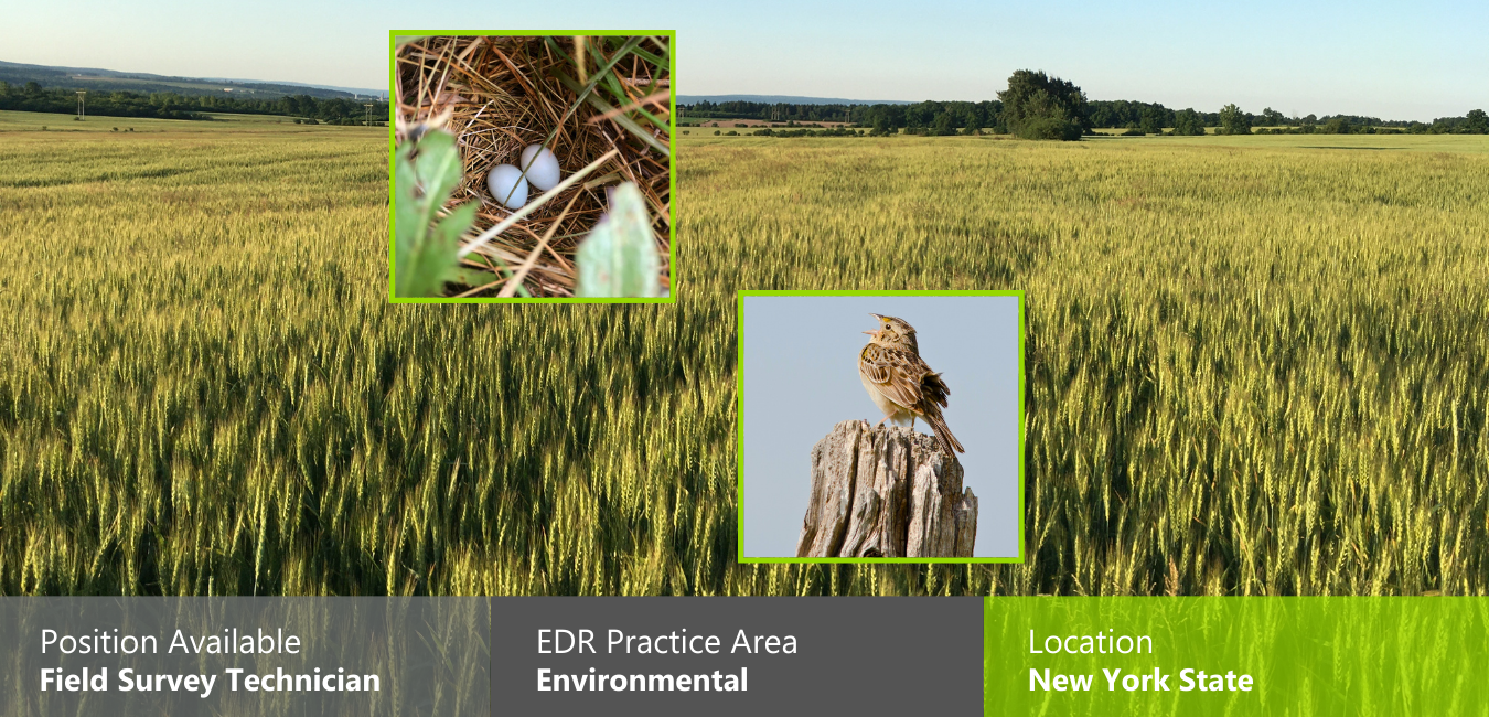 EDR is looking to hire qualified Field Survey Technicians to conduct avian surveys at proposed project sites in New York State. These positions are temporary (i.e., on a per-project or per-season basis) but may be extended depending on additional project opportunities and job performance. Avian surveys will primarily involve early morning breeding grassland bird surveys in rural settings; however, these positions may also include early morning/early evening marsh bird surveys, daytime forest raptor surveys, and/or evening winter raptor surveys at the same project sites.